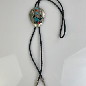 *AS-IS* OVERSIZED NATIVE AMERICAN PROFILE BOLO TIE TURQUOISE & CORAL STONES, BRAIDED LEATHER CORD