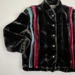 LATE 70S STRUCTURED COLORBLOCK STRIPED FAUX FUR BUTTON UP JACKET W/ LEATEHR TRIM