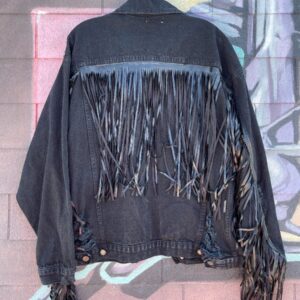 REWORKED OVERSIZED & DISTRESSED BLACK DENIM JACKET W/ FAUX LEATHER FRINGE