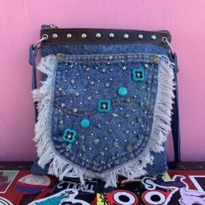 UPCYCLED DENIM CROSSBODY BAG TURQUOISE BEADS FRINGE EDGE