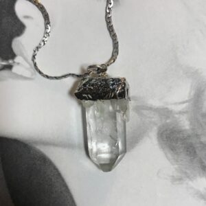 SILVER DIPPED CLEAR QUARTZ CRYSTAL STONE ON OXIDIZED SILVER CHAIN NECKLACE