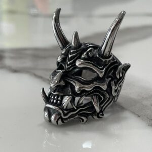 OVERSIZED 3-D LONG HORNED DEVIL FACE STAINLESS STEEL SILVER RING