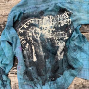 RAMONES PUNKS NOT DEAD HAND-PAINTED BLUE LONG SLEEVE FLANNEL BUTTON UP SINGLE FRONT POCKET SHIRT AS