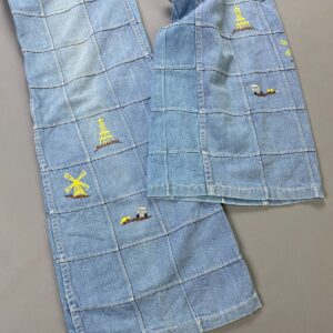 AMAZING! 1970S PATCHWORK WINDOWPANE DENIM BELL BOTTOMS EMBROIDERED EIFFEL TOWER AND WINDMILLS