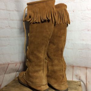 FRINGED KNEE HIGH SUEDE LACE-UP MOCCASIN BOOTS