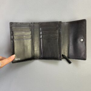 LATE 1990S POLISHED LEATHER TRI–FOLD WALLET MONOGRAM INTERIOR BRANDED ENAMEL BUTTON