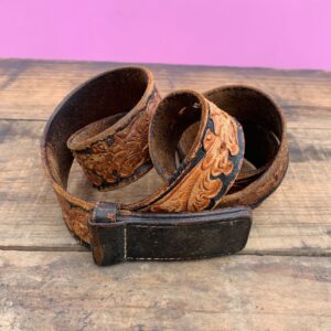 HAND-TOOLED FLORAL SCROLL LEATHER BELT WITH LEATHER BUCKLE