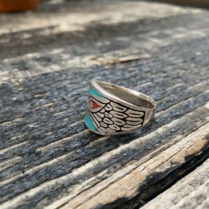 SOARING EAGLE CRUSHED CORAL, TURQUOISE & ONXY MOTORCYCLE BIKER RING