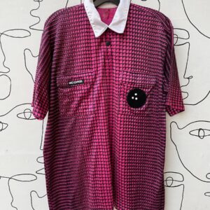 1990S BRIGHT FUNKY POLY BOWLING SHIRT W/ BOWLING BALL PATCH