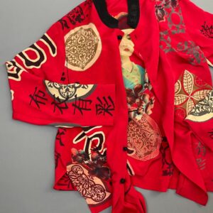 100% SILK BEAUTIFUL WOMAN PORTRAIT MANDARIN COLLAR BLOUSE FROG BUTTONS