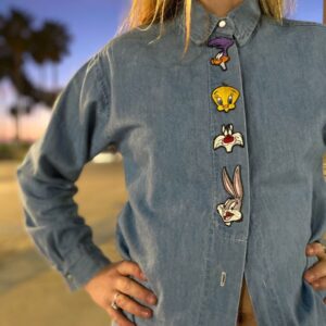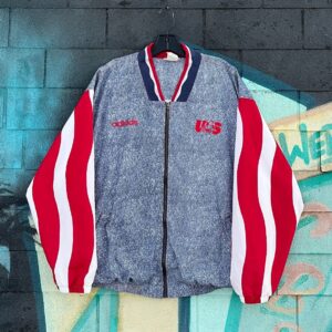 AMAZING & RARE 1990S ACID DENIM PRINT WINDBREAKER JACKET USA SLEEVES & BACK LETTERING