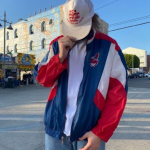 MLB CLEVELAND INDIANS COLORBLOCK WINDBREAKER W/ LARGE EMBROIDERED CHIEF WAHOO LOGO ON BACK
