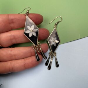 FLOWER DESIGN MOP & JET INLAY HOOK EARRINGS *STAMPED