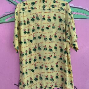 FUN! 100% SILK DO THE HULA ALL OVER PRINT HAWAIIAN SHIRT, COCONUT BUTTONS