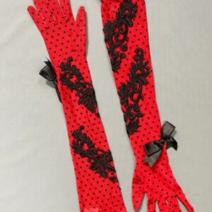 AMAZING!!! 1980S SHEER MESH RED POLKA DOT GLOVES WITH LACE AND BOW APPLIQUE