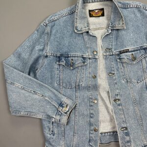 1990S OVERSIZED MEDIUM WASH HARLEY DAVIDSON DENIM JACKET LEATHER BACK PATCH