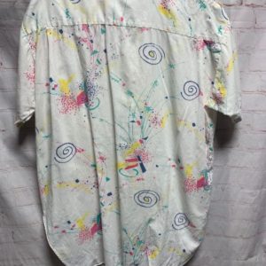 1980S FUNKY PASTEL PRINTED BLOUSE HIGH LOW HEM AS-IS
