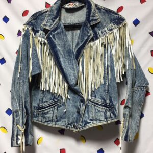 1980S RETRO WESTERN FRINGE ACID WASH FITTED SNAP FRONT DENIM BLAZER JACKET