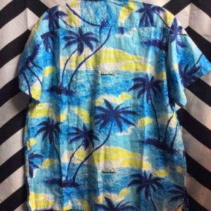 HAWAIIAN SHIRT W/ FLOWER/PALMS/HUT/SAILBOAT PRINT