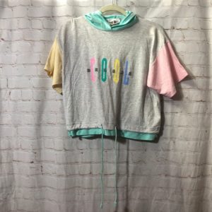 1980’S CROPPED PASTEL COLOR-BLOCK HOODED SHIRT COOL BREEZE GRAPHIC