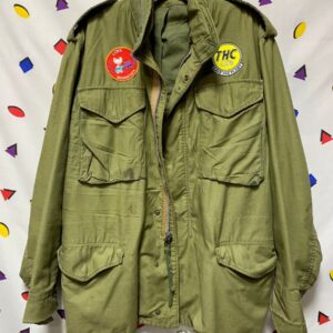 MILITARY JACKET VIETNAM ERA DISTRESSED W/ WOODSTOCK PATCHES AND VW BUG BACK GRAPHIC