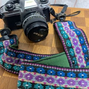 RETRO 1970’S FILM CAMERA STRAP W/ FUN PASTEL COLORED WOVEN FLORAL DESIGN