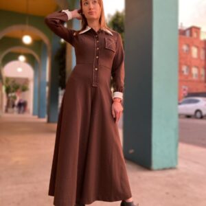 AS IS TWO TONE 1970S WIDE LEG BUTTON UP JUMPSUIT DAGGER COLLAR & CONTRAST STITCHING