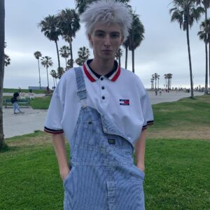 KILLER PINSTRIPE SEERSUCKER CONDUCTOR STYLE OVERALLS W/ GREEN STITCHING AS-IS