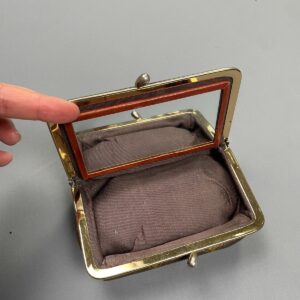 *AS-IS* 1960S CLEAR VINYL STRUCTURED SATIN-LINED MINI PURSE GOLD INNER METALLIC EMBROIDERY