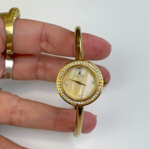 HIGH POLISHED GOLD HINGED BRACELET TIMEPIECE WATCH, CRYSTAL EMBELLISHED MOTHER OF PEARL FACE