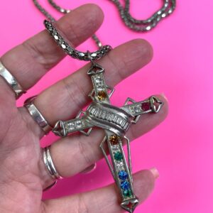 7-65 COLORFUL RHINESTONE OVERSIZED CROSS PENDANT NECKLACE MESH SNAKE CHAIN