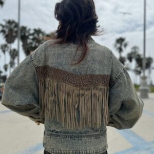RAD CROPPED & BELTED ACID WASHED DENIM JACKET SUEDE LEOPARD FRINGE
