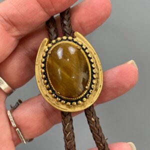 GOLD HORSESHOE & LARGE TIGERS EYE STONE INLAY PENDANT BROWN WOVEN LEATHER BOLO TIE