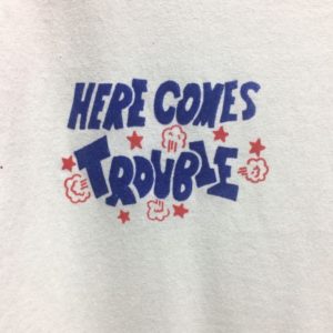 BASEBALL T- SHIRT W/ CONTRASTING SLEEVES W/ HERE COMES TROUBLE DESIGN