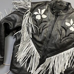 1980S TWO TONED LEATHER MOTORCYCLE JACKET WHITE TASSELS & FLOWER CUTOUTS
