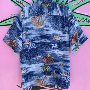 AS-IS 100% RAYON FISHING BOAT OCEAN SCENE HAWAIIAN SHIRT COCONUT BUTTONS