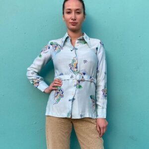 AS IS LONG SLEEVE BUTTON UP BLOUSE W/ MATCHING BELT ABSTRACT FLORAL PRINT