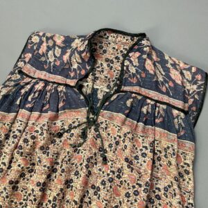 1970S INDIAN COTTON FLORAL PRINT CAP SLEEVE DRESS METALLIC BLUE STRIP