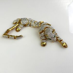 GORGEOUS! 1980S 2-TONE GOLD PLATED ARTICULATED TIGER OVER THE SHOULDER BROOCH, GREEN JEWEL EYES