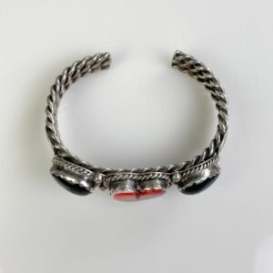 CARVED CORAL & ONYX HEART MOTIF TWISTED 925 STERLING SILVER CUFF BRACELET *SIGNED NAKAI