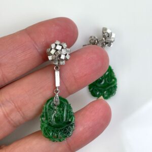 14K WHITE GOLD CARVED JADE EARRINGS, RHODIUM PLATED