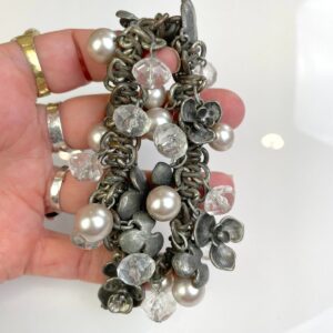 UNIQUE & CHUNKY ANTIQUE CHAIN LINK BRACELET HANGING PEARLS & FLOWER CHARMS