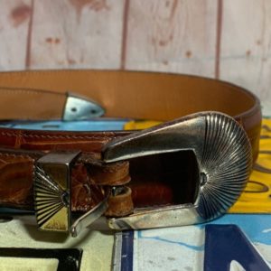BELT – LEATHER – EMBOSSED CROCODILE PATTERN – ORNATE SQUARE BUCKLE & TIP