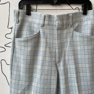 RETRO 1970S BABY BLUE POLYESTER PLAID PANTS SHORT HEM AS-IS
