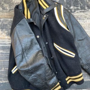 RETRO REVERSIBLE WOOL & LEATHER VARSITY JACKET W/ STRIPED KNIT CUFFS & COLLAR