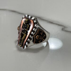 2-TONED SILVER & COPPER SKELETON IN CASKET BIKER RING SKULL & CROSS BONES