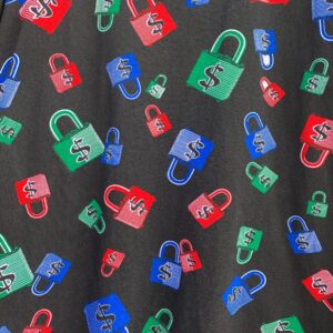 UNIQUE 1990S DEADSTOCK ALLOVER PRIMARY COLOR MONEY PADLOCK PRINT SHORT SLEEVE COTTON T-SHIRT