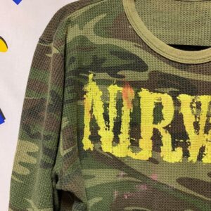 RADICAL NIRVANA CAMO THERMAL SHIRT HAND SCREENED NEVERMIND SMILEY FACE GRAPHIC *AS-IS *LOCAL ARTIST