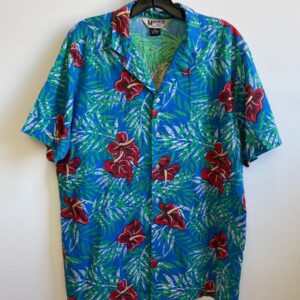 AMAZING 1980S COTTON HAWAIIAN SHIRT LARGE RED FLOWER & PALM LEAVES