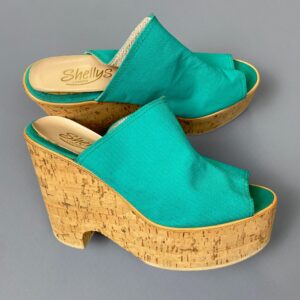 *AS-IS* 1970S LEATHER LINED CANVAS CORK PLATFORM PEEP TOE WEDGES